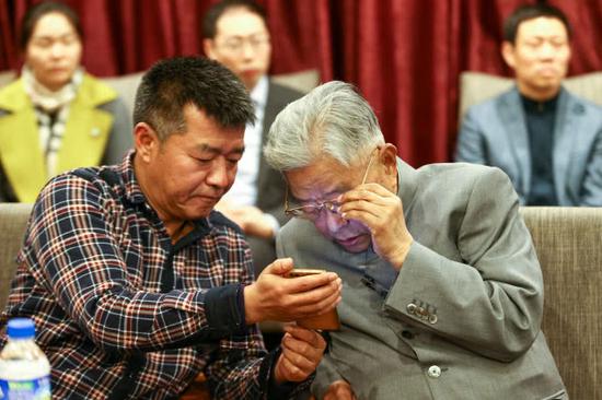 2018年,褚时健90岁生日时,褚一斌正给他看东西。图片来源:东方IC